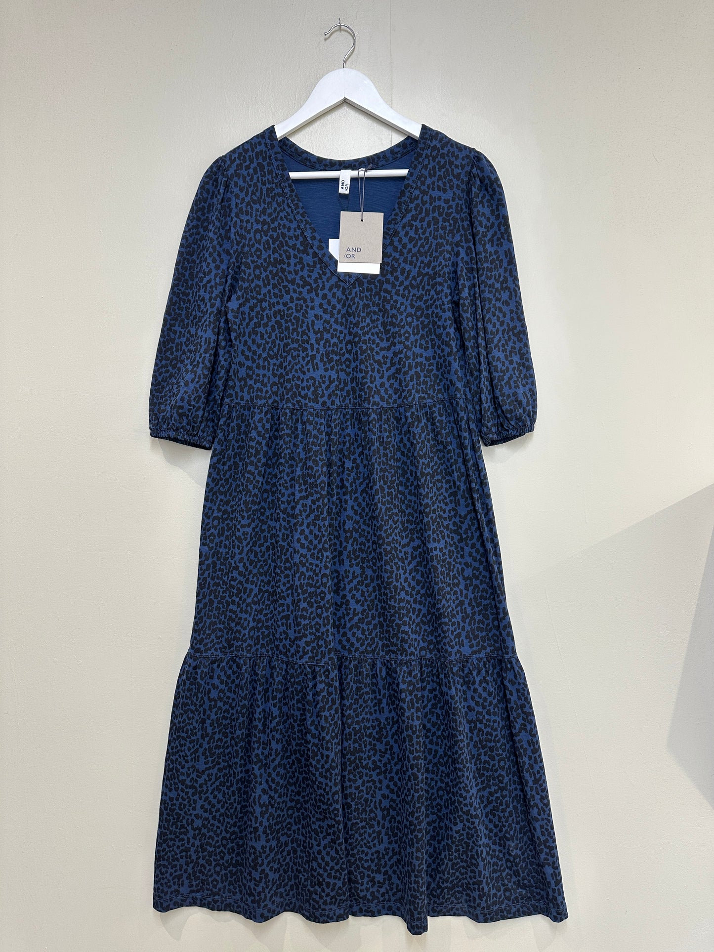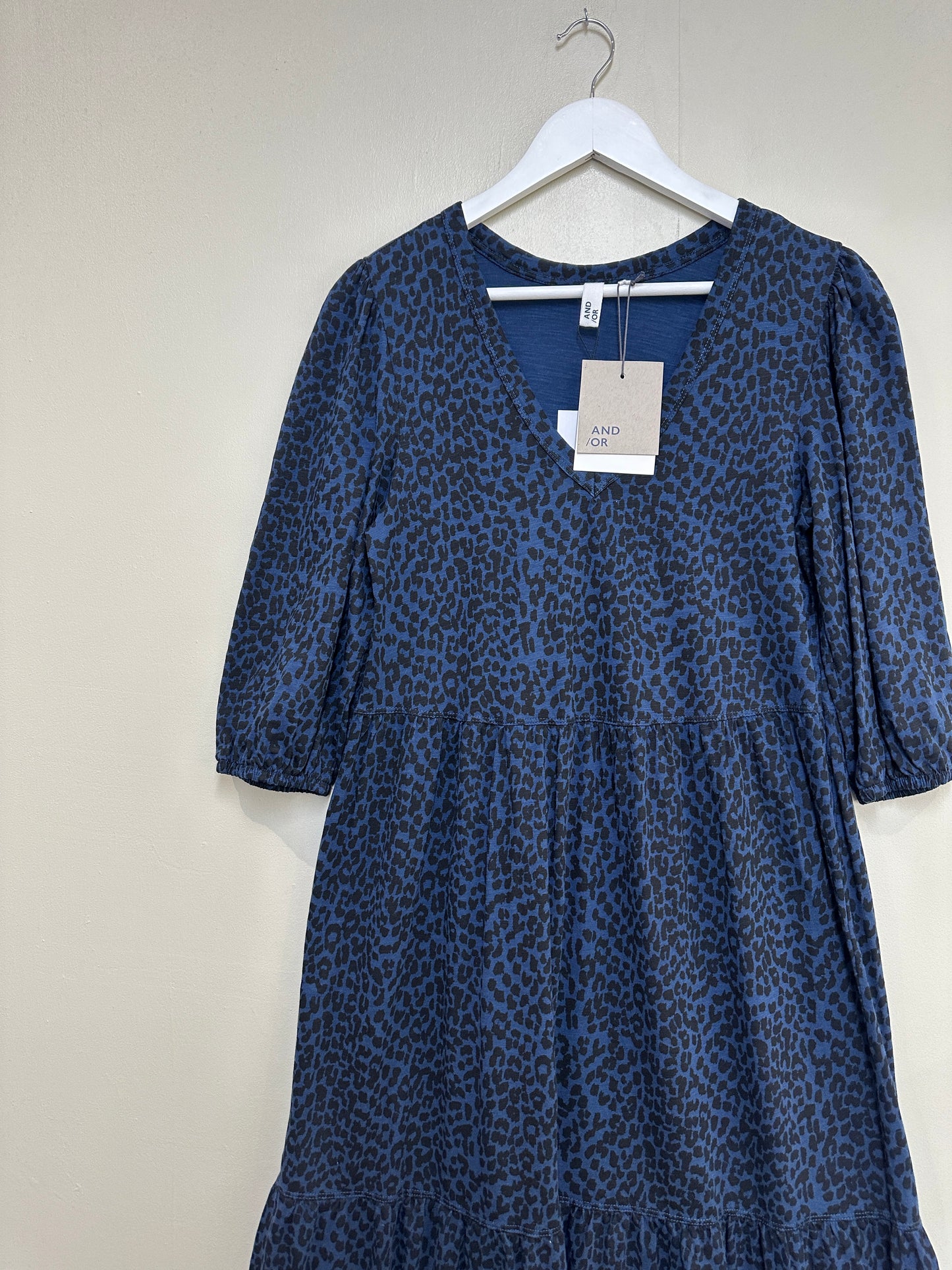 Add AND/OR Blue Black Animal Print Tiered Puff Sleeve Midi Dress - Size 8 to the cart