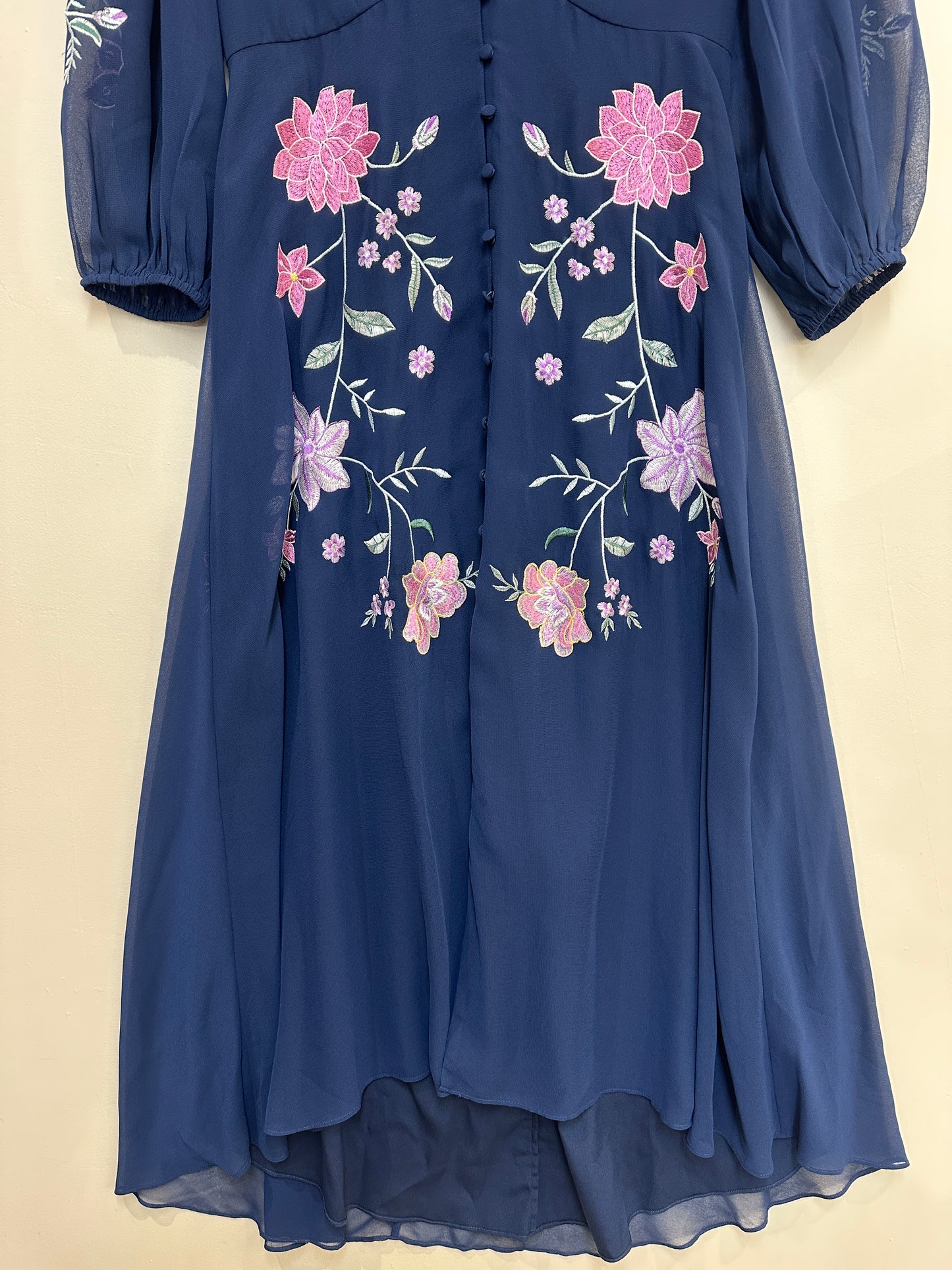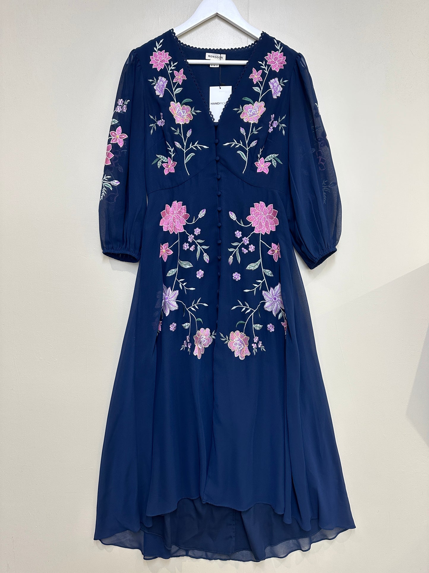 Monsoon Navy Pink Floral Appliqué Midi Dress - Size 12