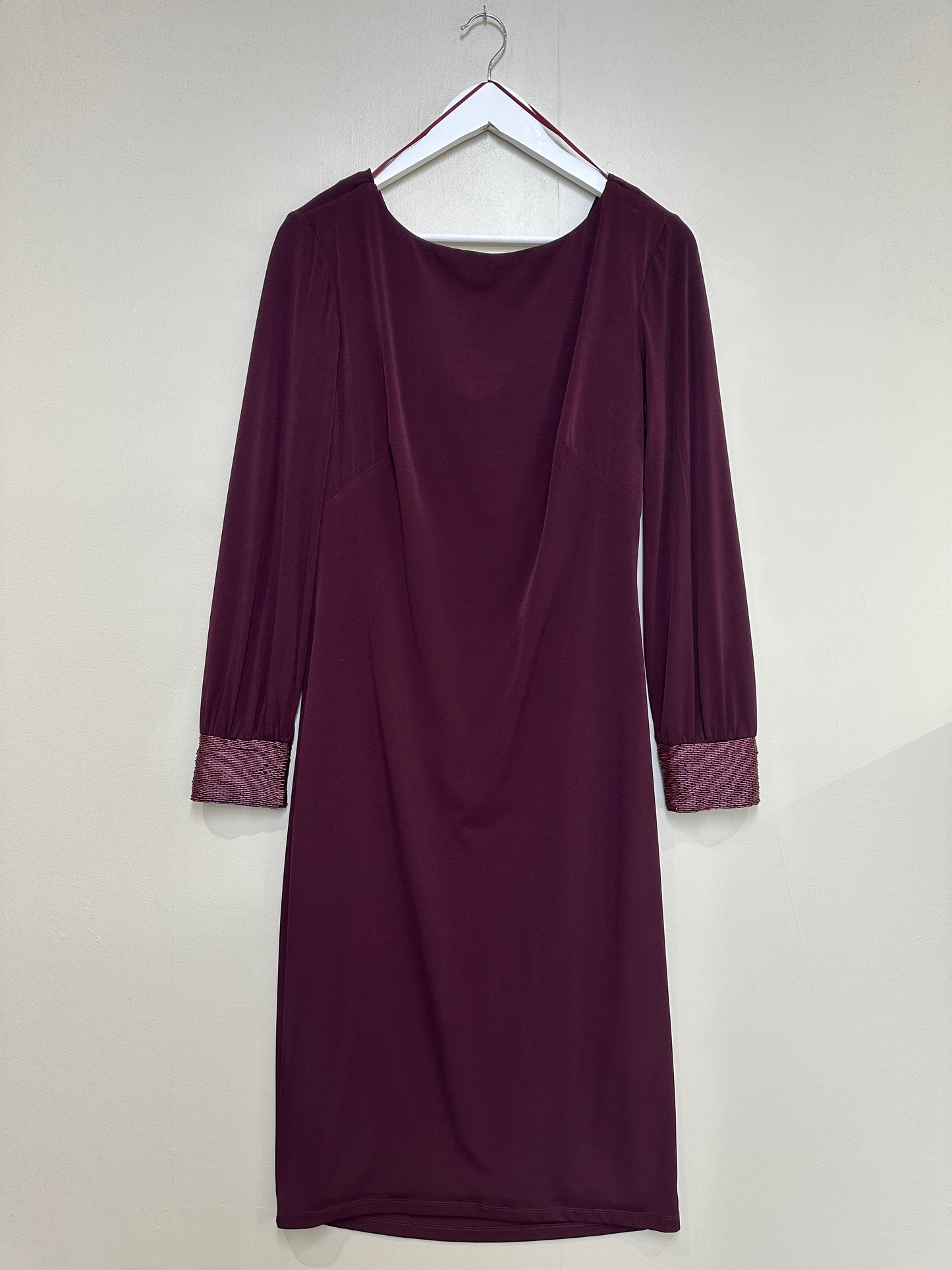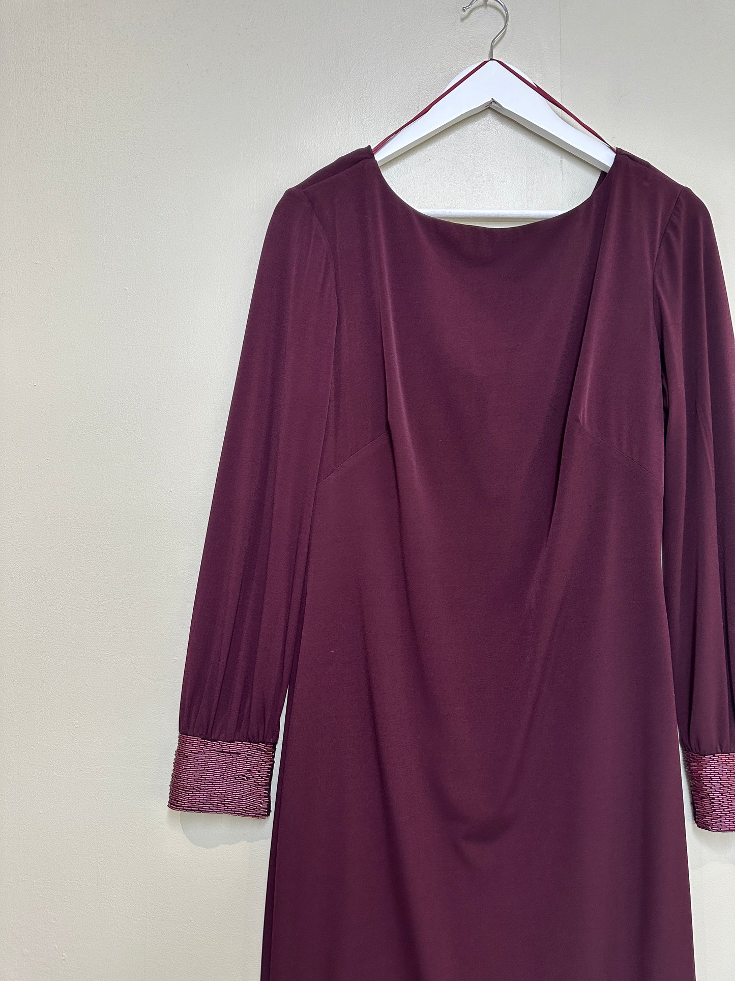 Biba Burgundy Long Sleeve Midi Scoop Back Beaded Cuff Dress - Size 14